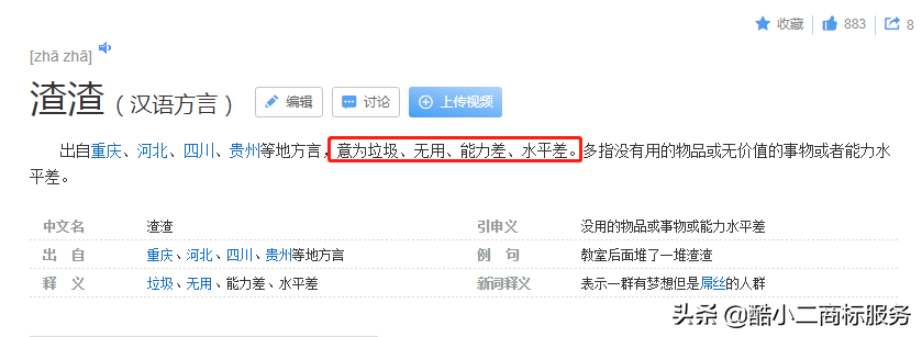 该案中,诉争商标为“渣渣辉”,“渣”在《现代汉语词典中》具有“渣滓、碎屑”的含义,作为网 络流行词,具有“差”、“烂”的意思,含有贬低人格的含义。